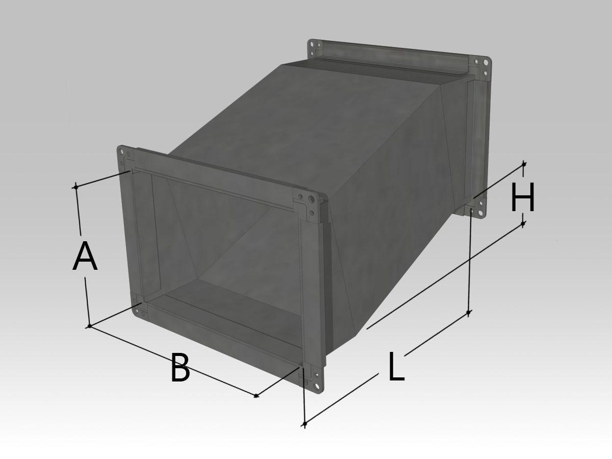 В случае, если воздуховоды на объекте невозможно разместить по прямой линии и необходимо сместить коммуникацию в сторону, используются специальные изделия S-образной формы - утки. Для заказа утки прямоугольного сечения нужно выбрать ее параметры: длину и ширину сечения, длину участка и размер смещения.